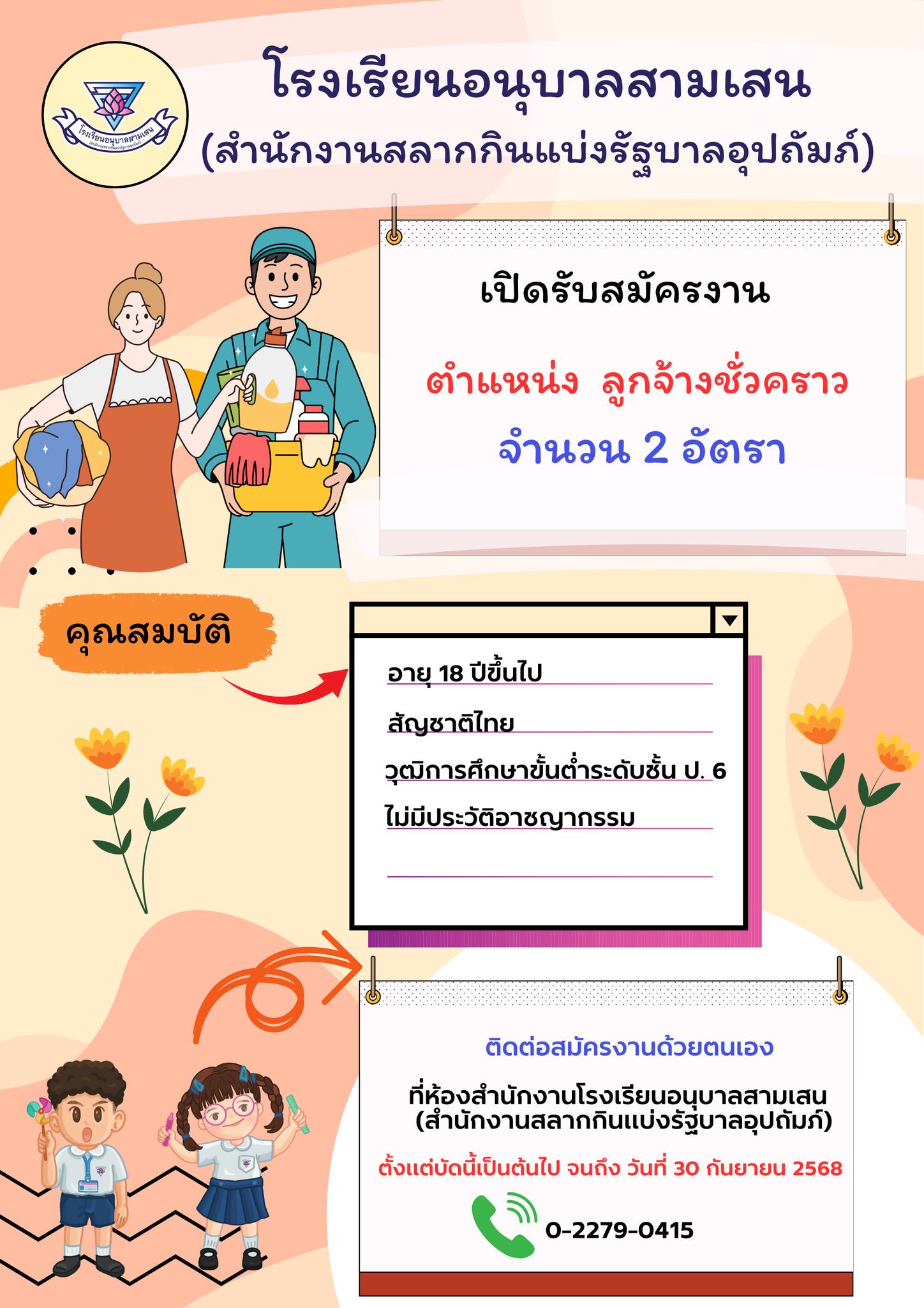 ประกาศโรงเรียนอนุบาลสามเสน (สำนักงานสลากกินแบ่งรัฐบาลอุปถัมภ์) เรื่อง เปิดรับสมัครงาน ตำแหน่ง ลูกจ้างชั่วคราว จำนวน 2 อัตรา ติดต่อสมัครงานด้วยตนเอง ที่ห้องสำนักงานโรงเรียนอนุบาลสามเสนฯ ตั้งแต่บัดนี้เป็นต้นไป จนถึง วันที่ 30 กันยายน 2568 0-2279-0415