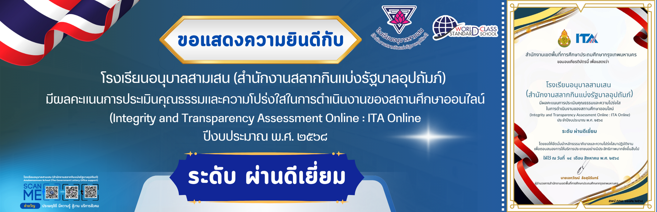 โรงเรียนอนุบาลสามเสน (สำนักงานสลากกินแบ่งรัฐบาลอุปถัมภ์) มีจุดมุ่งหมายที่จะพัฒนาด้านคุณธรรมและความโปร่งใสในหน่วยงานภาครัฐ ให้ความร่วมมือและเข้าร่วมการประเมินคุณธรรมและความโปร่งใสในการดำเนินงานของหน่วยงานภาครัฐ ปีงบประมาณ พ.ศ. 2561 – 2565 โดยใช้แนวทางและเครื่องมือการประเมินตามที่สำนักงานคณะกรรมการป้องกันและปราบปรามการทุจริตแห่งชาติ หรือ สำนักงาน ป.ป.ช. กำหนด